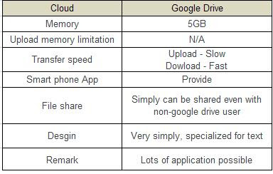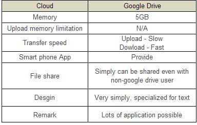 Google Drive is a kind of Cloud server such as Dropbox and box.net and the detail is posted as below table. It provides you with 5GB memory with no charge.